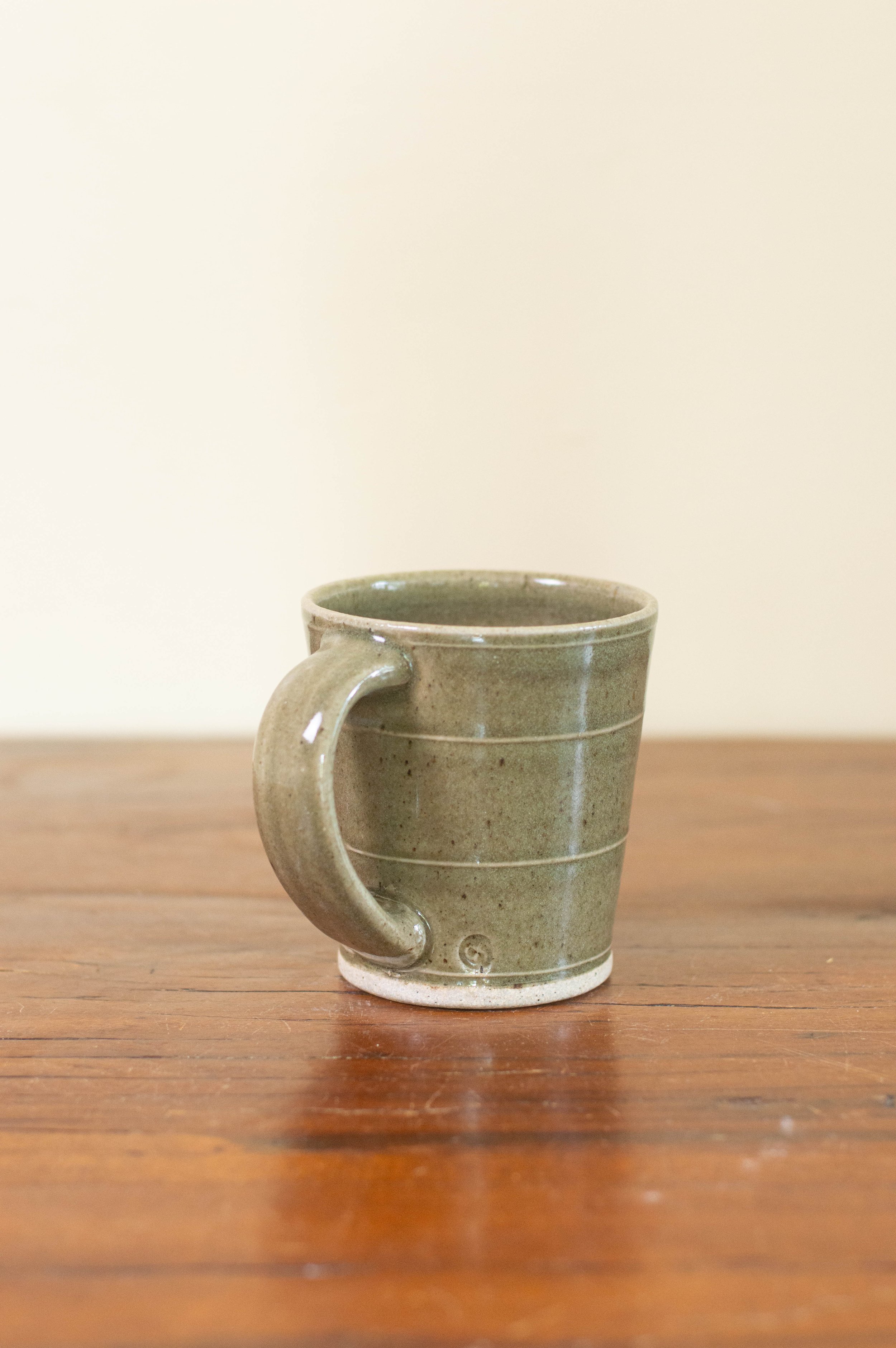 Charming gas-fired celadon mug, meticulously handcrafted to bring warmth to your daily rituals. Its unique glaze was crafted from local granite dust sourced in Raleigh, NC which horizontal white slip banding . Perfectly sized for a cup of coffee or tea, it promises to be both a functional favorite and a striking addition to your collection of handmade treasures.